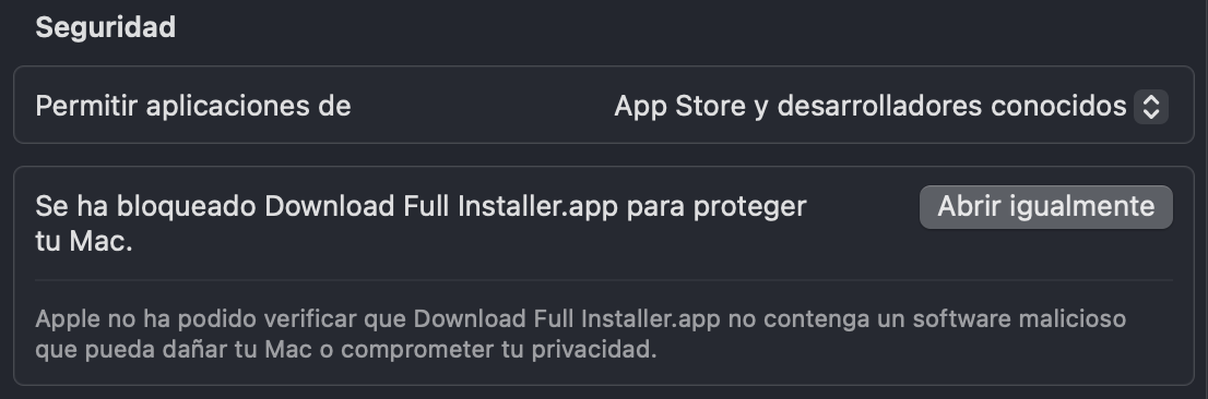 Esta es la advertencia que aparece cuando la aplicación no está firmada digitalmente ni notarizada por Apple, en cuyo caso la advertencia es más benigna, similar a las versiones anteriores a Sequoia.