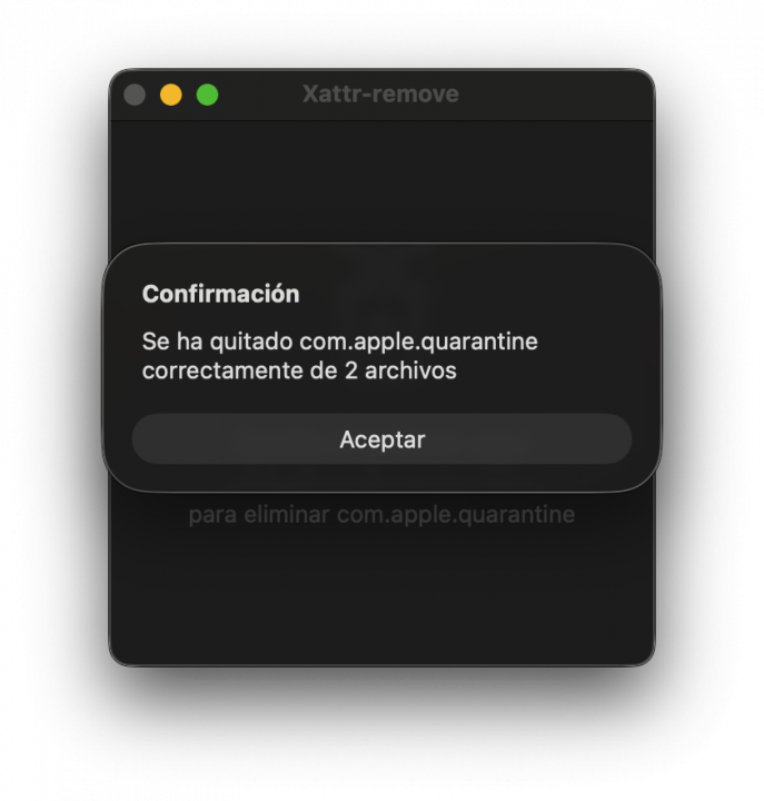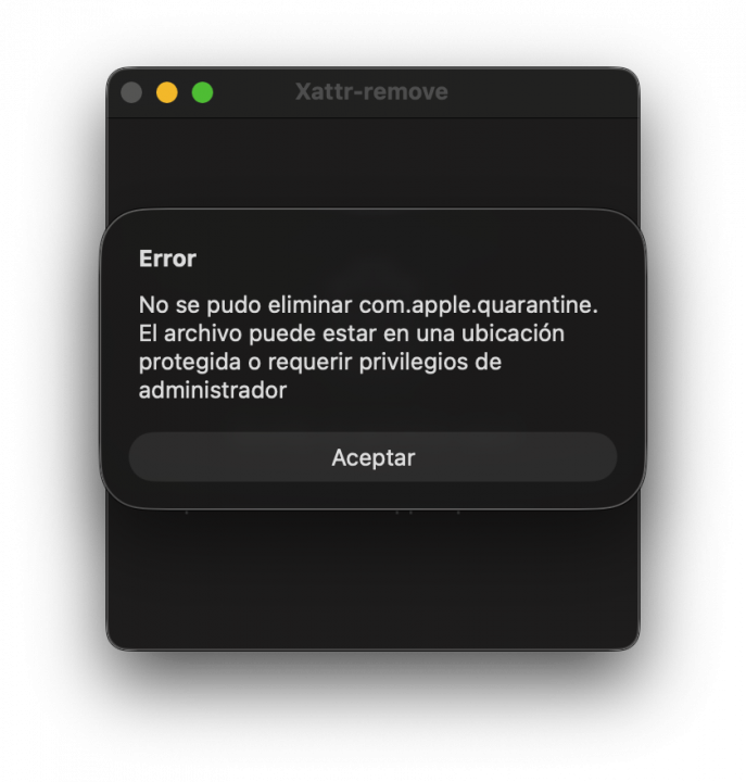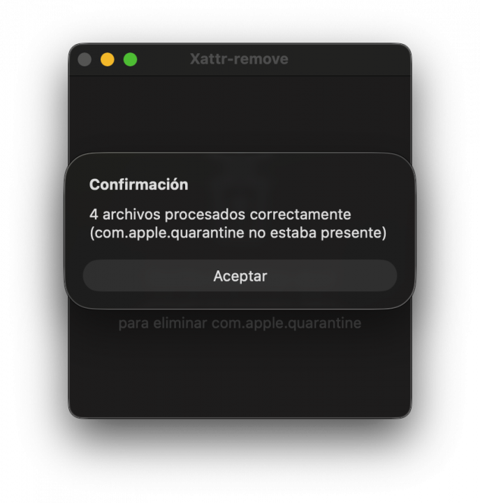 Xattr-remove, al ser una aplicación descargada de internet, también muestra la advertencia de Gatekeeper en la primera ejecución. Esto es inevitable, ya que la aplicación sólo está firmada ad hoc y no está notarizada.